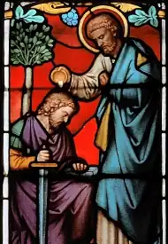 Im Kirchenfenster oberhalb des Altars erscheint Christus als himmlischer Herrscher. Er hält in der einen Hand das Buch des Lebens, in der anderen zwei Schlüssel, Zeichen für die Macht über Himmel und Hölle.