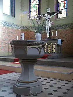 - ↑ Der Taufstein ist vermutlich ein Werk des Steinmetzmeisters Hugo Kielhorn aus Bernburg – vgl. dazu Marienkirche Bernburg