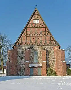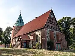 Der runde Kirchturm stammt aus dem 12. Jahrhundert. Er wurde 1464 mit der Kirche verbunden, ähnliche Rundtürme standen in Betzendorf (heute noch erhalten) und Amelinghausen (mittlerweile durch einen eckigen Turm ersetzt). Die Mauern sind mit 2,5 Metern außergewöhnlich dick.[3]