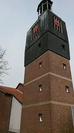 Die Gesamthöhe des Kirchturms beträgt rund 40 Meter, er hatte ursprünglich eine komplette Ziegelfassade. Aufgrund schadhafter Herstellung platzen immer mehr Ziegelsteine ab und so konnte der obere Teil des Turms erst im Jahre 1977 mit Kupferplatten verkleidet werden. Die Spitze des Kirchturms ist stilisiert und nicht massiv ausgeführt. Auf den Schalllöchern wurden Zifferblätter angebracht.