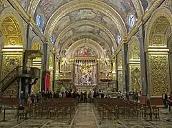 Das Innere aus der Zeit des Hochbarock ist sehr kunstvoll und reich dekoriert. Die Ausstattung erfolgte nach Plänen und unter Leitung des kalabrischen Künstlers und Malteserritters Mattia Preti. Er schuf die kompliziert geschnitzten Steinwände und bemalte die Gewölbe und Seitenaltäre mit Szenen aus dem Leben des Heiligen Johannes. Bemerkenswert ist, dass die Schnitzereien an Ort und Stelle geschaffen wurden und nicht wie üblich unabhängig voneinander geschnitzt und dann an den Wänden angebracht wurden (z. B. Stuck).