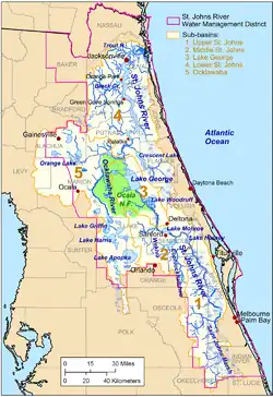 | Linke Nebenflüsse | Mills Creek River, Econlockhatchee River, Wekiva River, Black Water Creek (Lake County), Alexander Springs, Salt Springs Run, Ocklawaha River, Cross Florida Barge Canal, Rice Creek/Simms Creek, Black Creek, Ortega River, Trout River | |