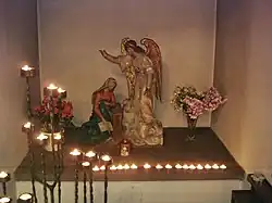 Der Altarraum wird von einem Buntglasfenster, davor ein Kruzifix, dominiert. Statuen links und rechts vom Altarraum zeigen Maria und Josef. Weitere Statuen, vor denen Opferkerzen aufgestellt werden können, stellen die Verkündigung des Herrn dar. Auch eine Pietà gehört zur Ausstattung der Kirche.