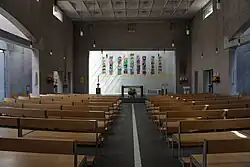 Schmale Seitenschiffe erhalten von oben und hinten Tageslicht. Der leicht erhöhte Altarraum wird durch indirektes Licht von oben aufgehellt. Seine leicht konkave Rückwand erinnert an eine Staumauer gegen den dahinter ansteigenden Berg. Im rechten Seitenschiff befindet sich die eng und hoch wirkende Marien- oder Geburtskapelle mit der von Hans von Matt geschaffenen, vergoldeten Madonna. Im linken Seitenschiff als Pendant dazu die Totengedenkstätte mit einer zerrissenen Platte als symbolisches Zeichen der Endlichkeit des menschlichen Daseins. Unter dem Bogen der rechten Seite kann der mit einer mobilen und farbig bemalten Wand abgetrennte Vorraum zum Gemeindesaal geöffnet und der Kirchenraum dadurch erweitert werden. Ebenfalls ist von dort die in blauer Farbe gehaltene Taufkapelle zugänglich. In halbrunder Anordnung sind die Kirchenbänke beidseits des Mittelgangs angeordnet. Ein gelber Farbstreifen zieht sich quer über die Altarrückwand als Symbol der Verbindung zwischen Geburt und Taufe, Leben und Tod. Der Altar steht wie das Lesepult und der Kerzenständer auf kubischen Sockelelementen aus dunklem Gestein, in denen jeweils die helle Altarplatte, das Pult oder der Kerzenhalter, gleich einer traditionellen Holzverbindung, eingefügt sind. Von der Altarmitte zur Eingangspforte ist ein weisser Streifen im Basaltsteinboden eingelassen. Mit den Farben Blau für den Himmel im rechten Bereich, Gelb für die Erde und Grün für den Frühling und die Hoffnung auf der linken Seite sind meditative Anregungen gegeben. Elementare Grundbedürfnisse des Menschen prägen die Kirchenanlage: Licht das von oben kommt; Wasser das aus einer Quelle ins Taufbecken und in gerader Linie unterirdisch zum nahen Sulgenbach geleitet wird; Brot vom Altar, eine gerade Linie führt zum alten Backofenhaus auf dem Dorfplatz; Türen, der Treppenaufgang mit der Rollstuhlrampe in der Mitte zum Kirchenhof mit Zugang zu allen Räumen und der wie bei romanischen Portalen nach innen gestufte Eingang zur Kirche. Von Beginn der Planung an, waren der Künstler Kurt Sigrist für die bildhauerischen Arbeiten und der Maler Godi Hirschi für die Farbgestaltung eng mitbeteiligt; ihre Handschrift ist deutlich zu erkennen.
