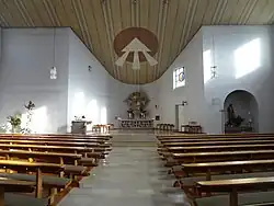 Im Zuge der liturgischen Neugestaltung im Jahr 2000 wurde das vormalige bronzene Altarkreuz von Hans Wurmer, von dem in Saal an der Donau noch ein weiterer, kleiner Guss existiert, außen über dem Hauptportal angebracht. Innen wurde ein ebenfalls von Wurmer geschaffenes dezenteres Kreuz angebracht, dem eine kreisrunde Bronzescheibe vorgeblendet ist. In deren Mitte befindet sich ein Relief des Gekreuzigten, der von sieben Medaillons mit biblischen Darstellungen umgeben ist, die die sieben Sakramente veranschaulichen sollen. Auf der linken sind dies von oben nach unten: die Taufe durch Taufe Jesu im Jordan (vgl. Mt 3,13-17 ), die Firmung durch die Sendung des Heiligen Geistes (vgl. Apg 2,1-13 ) und die Buße durch das Gleichnis vom verlorenen Sohn (vgl. Lk 15,11-32 ). Das Relief an der Tabernakeltür zeigt die Einsetzung der Eucharistie anhand des letzten Abendmahls. Auf der rechten Seite sind von unten nach oben dargestellt: die Priesterweihe durch Errettung der Jünger aus dem Sturm durch Jesus (vgl. Mt 8,23-27 ), das Ehesakrament durch Adam und Eva (vgl. Gen 3,7-13 ) sowie die Krankensalbung durch Heilung des Tobit durch Tobias (vgl. Tob 11,1-15 ).[3]