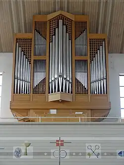Zur Entstehungszeit der Kirche wurde lediglich eine elektronische Orgel eingebaut. Unter Pfarrer Siegfried Heilmer gelang es dank zahlreicher Spender, diese durch eine Pfeifenorgel zu ersetzen. Das vollmechanische Schleifladeninstrument mit insgesamt 18 klingenden Registern auf zwei Manualen und Pedal erbaute Georg Jann aus Allkofen bei Laberweinting. Es wurde am Kirchweihsonntag, dem 19. Oktober 1986, durch Generalvikar Fritz Morgenschweis eingeweiht. Die Disposition lautet wie folgt:[3][4]