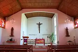Im Zuge dieser Renovierungsarbeiten Anfang der 1980er Jahre wurde der Chorraum der Kirche komplett neu gestaltet und der Kirchenraum der Liturgie des Zweiten Vatikanums angepasst. Die Fenster entwarf der Kunstmaler Jacques Schedler. Im Kirchenschiff zeigen sie wie Oberlichter die Symbole des Kreuzweges. Gezeigt werden zentrale Elemente des Karfreitags: Jesu Geisselung wird im ersten Fenster auf der linken Seite dargestellt, gefolgt von der Dornenkrone, dem Essig und de Würfeln, mit denen die Soldaten um das Kleid Jesu gespielt haben. Auf der rechten Seite wird der Verrat des Petrus durch den Hahn angedeutet. Ihm folgen die Nägel, mit denen Jesus ans Kreuz geschlagen wurde, der Schwamm, mit dem Jesus Essig zu trinken bekam und schliesslich das INRI-Zeichen, das auf die königliche Dimension von Jesus verweist. Zwei weitere Fenster befinden sich hinter der Brüstung der Orgelempore versteckt. Beim Aufgang zur Orgel findet sich die Darstellung von Jerusalem, auf der gegenüberliegenden Seite der Vorhang des Tempels, der im Moment des Todes von Jesus zerriss. Sind die Fenster im Kirchenschiff in Rottönen gehalten, so ist die bestimmende Farbe des dreiteiligen Chorfensters Blau. Da dieses Fenster geostet ist, flutet morgens Sonnenlicht durch das durch dieses Fenster, das die Auferstehung Christi darstellt und damit der Karfreitagsgeschichte die Ostergeschichte gegenüberstellt. Die Fensterrosette über dem Kirchenportal zeigt den Heiligen Geist als Taube dargestellt. Auf der linken Seite des Kirchenportals befinden sich zwei weitere Glasfenster von Jacques Schedler, welche mit den Motiven von Trauben, Korn und Brot auf die Eucharistie verweisen. Neben den Glasfenstern, die das Innere der Kirche prägen, finden sich weitere Ausstattungselemente, so das Holzkreuz mit Korpus im Chor, die Schnitzfiguren von Maria mit Kind und Josef, die Kreuzweg-Tafeln von Karl Ruff sowie der Tabernakel mit der Inschrift «Gott ist da». Diese Elemente stammen aus der Entstehungszeit der Kirche.[5]