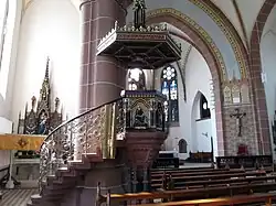 Die aus Holz gefertigte Kanzel, die mit einem der Vierungspfeiler direkt verbunden ist, befindet sich auf einem Unterbau aus Sandstein, der auf kleinen grauen Marmorsäulen ruht. Die Brüstung der Kanzel zeigt bemalte Reliefs der vier Evangelisten und ihren Symbolen: Matthäus mit dem geflügelten Menschen, Markus mit dem Löwen, Lukas mit dem Stier und Johannes mit dem Adler. In der Mitte des Schalldeckels der Kanzel sieht man eine Darstellung der Taube, das Symbol des Heiligen Geistes[8].