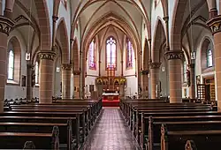 Das Kirchengebäude wurde als dreischiffige Basilika im Stil der Neugotik errichtet und gliedert sich in den Turm mit Spitzhelm, das Langhaus und den fünfseitigen polygonal abschließenden Chor. Das Langhaus selbst ist nochmals in fünf Joche untergliedert, deren Decken von vierteiligen Kreuzrippengewölben gebildet werden.