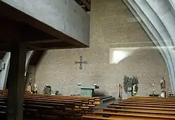 Das im Inneren mit Holz verkleidete Satteldach wird von sechs offenen dreigelenkigen Betonbindern getragen, die an der ebenfalls offenen Firstpfette zusammenlaufen. Von den sieben Jochen werden zwei für den Altarbereich beansprucht. Analog zum basilikalem Grundriss flankieren niedrige Gänge den hohen Hauptraum. In ihnen befinden sich die 14 Kreuzwegstationen, die bereits in der alten Kapelle hingen. Die Seitenwände bestehen wie die Altarwand aus ockergelbem Sichtmauerwerk. Dem oberen Abschnitt des verglasten rückwärtigen Giebels vorgelagert steht die Empore frei auf sechs Stützen. Auf ihr ist die Orgel installiert. Hinter dem seitlich versetzten Portal befindet sich ein Vorraum, daneben stehen die Beichtstühle, benachbart von ihnen liegt die Werktagskapelle.
