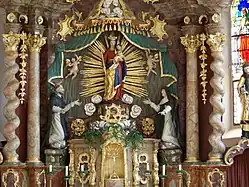 Der Hochaltar wurde im Jahr 1754 von dem Schreiner Lorenz Grindtl aus Pfeffenhausen angefertigt und ist im Rokokostil gehalten. Er steht auf einem breiten, fast mannshohen Sockel, auf dem vier Säulen postiert sind. Während die beiden inneren Säulen glatt ausgeführt wurden, sind die äußeren, weiter in den Raum vorgeschobenen Säulen gewunden. Die vergoldeten Säulenkapitelle sind aufwändig gestaltet und mit Fruchtgehängen verziert. Der Altar ist reich mit Muschelwerk verziert. Oberhalb der Mensa befindet sich ein vergoldeter Tabernakel mit Aussetzungsnische, der von zwei Paaren vergoldeter Volutenpilaster gerahmt wird. Darüber steht auf einem Sockel, der aus einer versilberten Wolke zu entspringen scheint, die Hauptfigur des Altares: eine bekrönte Mutter Gottes mit Kind aus dem 19. Jahrhundert, die von einem goldenen Strahlenkranz hinterfangen ist und von zwei zierlichen Putten flankiert wird. Letztere spannen scheinbar einen dunkelgrünen Baldachin mit zahlreichen vergoldeten Quasten auf. Zu Füßen der Mutter Gottes befinden sich zwei Figuren mit Bezug zum Dominikanerorden: links der Ordensgründer Dominikus mit einem kleinen Hund, rechts die heilige Katharina von Siena, die auch als Patronin Europas gilt, mit Dornenkrone. In dem geschweiften Aufsatz, der von zwei puttenbesetzten Voluten eingerahmt wird, befindet sich in einem ebenfalls geschweiften Rahmen ein Gemälde der Kirchenpatronin Katharina mit einem Palmzweig. Über den beiden seitlichen Durchgängen des Altäres befindet sich links eine Figur des heiligen Sixtus mit Papstkreuz und Tiara, eine spätgotische Plastik mit neueren Ergänzungen, und rechts eine Figur des heiligen Paulus, die ein Werk der Frührenaissance darstellt und wohl der Zeit um 1550 entstammt.[2]
