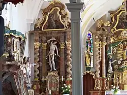 Die Hauptfigur des nördlichen (linken) Seitenaltares stellt den heiligen Sebastian dar. Das Gemälde im Auszug zeigt eine Schutzengeldarstellung. Am südlichen (rechten) Seitenaltar fungiert der heilige Leonhard als Hauptfigur. Im Auszug befindet sich ein Gemälde des heiligen Josef mit dem Jesuskind. Außerdem wurden am Tabernakel die Türchen entfernt, sodass der Blick auf ein kleines Schnitzrelief der Heiligen Familie frei wird.[2]