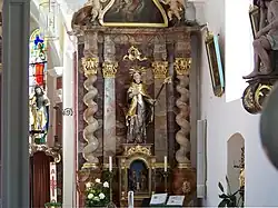 Der Seitenaltäre, die sich zu beiden Seiten des Chorbogens befinden, sind als Pendants angelegt. Sie verfügen jeweils über einen Aufbau, der von zwei Pilastern und zwei gewundenen Säulen mit aufwändigen Kapitellverzierungen getragen wird. Auf dem Tabernakel, der von zwei kleinen Säulchen flankiert wird, befindet sich jeweils ein Podest, welches die Zentralfigur trägt. Der geschweifte Aufsatz wird von je zwei auf Voluten sitzenden Putten flankiert und ist asymmetrisch ausgeführt – ein typisches Stilmerkmal des Rokoko. Darin befindet sich jeweils ein Gemälde in einem vergoldeten Rahmen, der ebenfalls eine unregelmäßige Kontur aufweist. Die beiden Altäre wurden 1773 von dem Landshuter Maler Ignatius Kauffmann gefasst.[2]