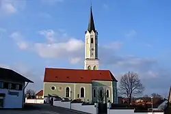 Rund um die Kirche erstreckt sich der Dorffriedhof, an dessen westlichem Ende eine Seelenkapelle. Diese ist ein massiver Bau mit steilem Satteldach aus der ersten Hälfte des 19. Jahrhunderts. Neben der Eingangstür ist in einer stichbogigen Nische eine Figur Unserer Lieben Frau von Lourdes eingelassen. An der Außenseite der Friedhofsmauer befindet sich das Kriegerdenkmal, an dem der Gefallenen und Vermissten der Kriege von 1870/71, 1914–18 und 1939–45 gedacht wird.