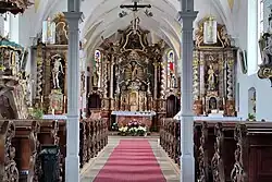 Gegenüber der Kanzel befindet sich ein Missionskreuz. An dessen unterem Ende sitzt auf einer Konsole eine Figur des Erbärmdechristus. Am Chorbogen ist ein Kruzifix angebracht, an dessen Kreuzesarmen jeweils ein kleiner Putto mit wallendem Gewand angebracht ist. Neben dem nördlichen Seitenaltar befindet sich eine Herz-Jesu-Figur. Von besonderem Interesse sind außerdem die barocken Stuhlwangen aus der Zeit um 1720. Diese sind mit Akanthusrankwerk und gerieften Bändern verziert.[2]