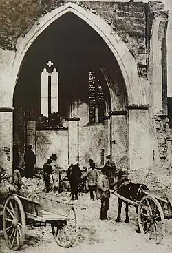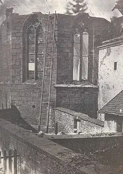 Nachdem der Abriss des Kirchenschiffes vollendet war, zeigte sich, dass die polygonale Apsis zunächst ungewölbt errichtet und erst später mit einem gotischen Gewölbe versehen worden war. Dabei waren die tragenden Wandpfeiler allerdings nicht mit den Mauerverbänden des Ursprungsbaues verbunden worden. Durch den Gewölbeschub und Fundamentsetzungen hatten sich die unterschiedlichen Komponenten unmerklich voneinander getrennt. Bei der Untersuchung der Gewölbe, sah man, dass sich in der Höhe die Pfeiler des Apsisgewölbes von den Umfassungsmauern etwa einen Fuß breit entfernt hatten. Daraufhin fasste man den Beschluss, nun auch die gotische Apsis ganz abzubrechen und durch Himpler einen völlig neogotischen Ersatzbau zu erstellen.[42]