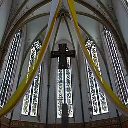 Feine Runddienste nehmen die Rippen des Apsisgewölbes auf, dessen Kappen tief heruntergezogen sind. Die Schlusssteine sind mit reich reliefiertem und farblich hervorgehobenem Rankenwerk verziert. Der Schlussstein der Apsis zeigt einen gekrönten Wappenschild der Familie Galhau: Auf blauem Grund wird der Schild durch ein goldenes Band geteilt. Darüber befinden sich drei goldene Sterne, darunter eine liegende goldene Mondsichel. Die hohen Chorfenster brechen im gotischen Sinne die Wandfläche großformatig, himmelstürmend auf und tragen zur erhöhten Helligkeit der Altarraumes bei. Die Chorfenster sind zweibahnig angelegt. Die Bahnen enden in gotischen Spitzbögen mit eingestellten Nasen. Der darüber liegende Spitzbogen ist mit einem Kreis, in dessen Innerem sich ein stehendes Vierpassmaßwerk befindet, geschmückt. Die Ausbuchtungen des Vierpasses sind nochmals mit einem angehängten Zirkelschlag ausgeweitet, sodass ein Gebilde aus 12 Zirkelschlägen entsteht. Acht annähernde Dreiecke füllen die dadurch gebildeten Lücken aus.