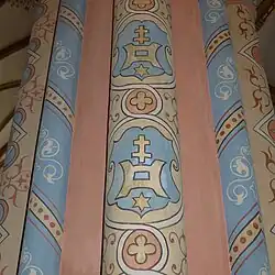 Die Ausmalung des Kircheninneren nahm von 1878 bis 1882 der Merziger Kirchenmaler Johann Georg Fröhlich vor. Die Beauftragung datiert auf den 8. Juli 1878.[51] Fröhlich fasste die Gewölbe ultramarinblau und besetzte die Flächen mit vergoldeten Sternen von neun Zentimetern Durchmesser. Der Chorbereich wurde mit Teppichmalereien ausgeschmückt. Die Fensterlaibungen, Gurte und Dienste versah Fröhlich mit bunten Ornamenten, die teilweise Vergoldungen aufwiesen. Die Pfeiler des Mittelschiffes wurden rot getönt. Auch dessen Wandflächen wurden bis zur Höhe der Kapitelle rot angestrichen. Die Wände der Seitenschiffe versah Fröhlich bis zur Höhe der Fenster mit einem bunten Teppichmuster, während er die darüberliegenden Flächen mit einem Quadermuster bemalte. Passend farbig gefasst und teilweise vergoldet wurde im Zuge dieser Maßnahme auch die Kirchenausstattung. Insgesamt hüllte die Raumfassung Fröhlichs den Sakralraum in ein mystisch-abgedunkeltes festliches Farbenspiel. Im Jahr 1882 berichtete der damalige Wallerfanger Pfarrer Karl Joseph Petry dem Trierer Generalvikariat über das Zustandekommen der farblichen Fassung des Kirchenraumes: „Obwohl die Kirche noch neu ist, hatte sich in Folge des zwar soliden, aber rauen Verputzes eine solche Menge Staub an den Wänden festgesetzt, und an verschiedenen Stellen dermaßen geschwärzt, daß das Innere der sonst schönen Kirche die Würde vermissen ließ, welche dem Gotteshaus doch vor allem geziemt; ich hielt es deshalb für meine Pflicht, nicht länger auf die Einwendungen zu achten, welche einflussreiche Persönlichkeiten gegen die Dekoration der Kirche überhaupt erhoben ... und forderte zu freiwilligen Beiträgen auf.“[52]