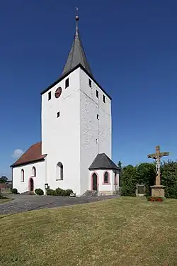 Die gotische Chorturmkirche steht das Ortsbild prägend auf einer Kuppe im nordwestlichen Teil des Dorfes. Sie ist nach Nordosten gerichtet und großenteils von einer teils noch mittelalterlichen Friedhofsmauer aus Brockenquadermauerwerk umzogen.[2]
