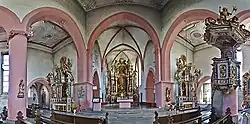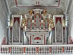 Der Hochaltar wurde 1722 gebaut. Die barocke Kanzel, die 1715 gebaut wurde, ist mit einem aufwendig dekorierten Schalldeckel versehen, der mit einer Figur des auferstandenen Christus bekrönt ist. Die Orgel mit dem barocken Prospekt steht auf der oberen, der doppelstöckigen Empore. Sie hat 43 Register, 3 Manuale und ein Pedal und wurde 2004 von Hey Orgelbau gebaut.[1]