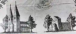Die Kirche auf einem Bittbrief des Pfarrers um Spenden für den Wiederaufbau nach dem Brand 1878. Vermutlich hatte die Kirche nie zwei voll ausgebaute Türme.