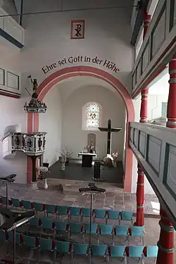 Die barock gestaltete Kanzel entstand um 1700. Sie ist über einen Aufgang durch die Sakristei zu erreichen und wird von vier stilisierten Palmen mit einer Weintraube getragen. Sechs aus Holz geschnitzte Figuren verzieren die Kanzel: die vier Evangelisten Matthäus, Markus, Lukas und Johannes sowie die beiden Apostel Petrus und Jakobus. Im Altarraum steht ein barocker Taufstein aus Sandstein aus dem Jahr 1627.