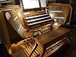 - Spielhilfen: 3 freie Kombinationen, Crescendowalze, Schwelltritt, Crescendo ab, General-Zungen ab, Man. 16′ ab, 2 freie Pianopedalkombinationen und Einzel-Zungenabsteller