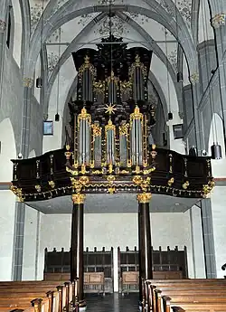 Darunter steht auf einer Empore die Orgel, die 1963 von der Orgelbaufirma Georg Stahlhuth aus Aachen im bereits vorhandenen Rokoko-Gehäuse des Vorgängerinstruments installiert wurde. Die erste Orgel wurde 1763 von dem Orgelbauer Johann Theodor Gilmann mit 19 Registern auf zwei Manualen und angehängtem Pedal erbaut.[25] 1913 wurde sie durch ein neues Instrument der Bonner Orgelbaufirma Klais ersetzt, das 1963 die St. Nikolaus-Kirche in Aachen erhielt. Die heutige Orgel besitzt 29 Register auf zwei Manualen und Pedal. Die Spieltrakturen sind mechanisch.[25]
