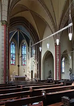 Im Zweiten Weltkrieg erlitt die Kirche erhebliche Schäden an den Fenstern und den Gewölben. Der Kirchturm wurde bei einem Bombenangriff völlig zerstört. Im Zuge des Wiederaufbaus wurde die neugotische Inneneinrichtung verändert und die Retabel der Altäre sowie die Kanzel, die Kommunionbank und der Kreuzweg wurden entfernt.