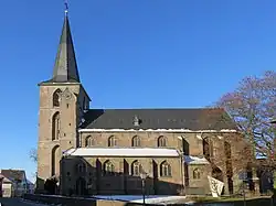 Die Kirche St. Lambertus ist eine vierjochige spätgotische Basilika mit einem zweijochigen Chor, der in einem vierseitigen Schluss endet. Sie wurde um das Ende des 15. Jahrhunderts bis ins 16. Jahrhundert hinein erbaut. Auf der Nordseite ist eine zweijochige Sakristei angebaut, im Westen steht ein viergeschossiger Westturm mit einem Treppenturm auf der Südseite. Eine Restaurierung erfolgte durch Lambert von Fisenne in den Jahren 1883–1889, wobei alle Veränderungen aus dem 18. Jahrhundert rückgängig gemacht wurden. Im Zweiten Weltkrieg wurden der Turm und die Dächer sowie ein Teil der Gewölbe zerstört; die Schäden wurden bis 1962 behoben.[1]