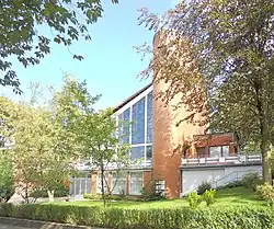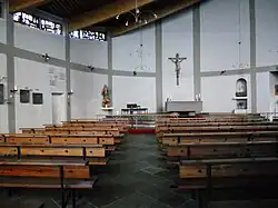 Das Gebäude wurde von 1962 bis 1964 errichtet.[1] Der Haupteingang der Kirche ist über den vor der Kirche angebauten Turm erreichbar. Im Durchgang hängt ein größeres Kruzifix. Die Orgel wurde 1990 durch Bruno Christensen & Söhne aus Terkelsbüll gebaut. Ein an der Westfront befindliches wandgroßes, französisches Kathedralglasfenster mit den Elementen sowie ein Kreuzweg gehören zur Ausstattung. Die Glocken gis’, h’ und c’’ wurden 1977 und 1993 von der Karlsruher Glockengießerei gegossen.[2] Der Altartisch aus Beton steht auf zwei runden massigen Betonsäulen. Über dem Tabernakel in einer Nische des Altarraums hängt das ewige Licht.