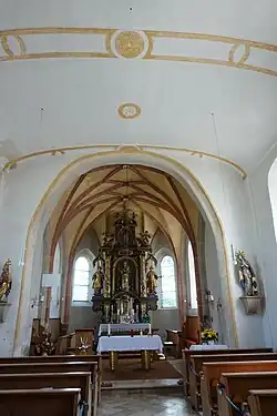 Das Langhaus weist drei Fensterachsen auf, der gotische Chor ein Joch und einen Dreiachtelschluss. Die Wanddienste setzen sich in den Rippen des Gewölbes fort und enden in einem Schlussstein. Es besteht eine Ähnlichkeit zum Gewölbe der Hinteregglburger Kirche des Münchener Werkmeisters Erhart Randeck.[11] Das Gewölbe des Langhauses ist neuzeitlich.[12] Der Eingang an der Südseite hat eine Holztüre mit sternförmigem Muster vom Anfang des 19. Jahrhunderts. Die Sakristei wurde südlich am Chorraum angebaut. Der beherrschende Mittelpunkt des Innenraums ist der Hochaltar aus dem 17. Jahrhundert in hochbarocker Art mit einer Mondsichelmadonna mit Jesu-Kind als kraftvolles Zentrum, um die sich ein Drache schlingt. Rechts von ihr steht eine Holzfigur des Hl. Stephanus mit Palmzweig, Buch und Steinen, links der Kirchenpatron Laurentius mit Palmzweig und einem Rost als Attribut. Rechts vom Chorbogen befindet sich eine Mater Dolorosa des 18. Jahrhunderts, links eine auf ca. 1520 datierbare Schnitzfigur des Hl. Silvester.[13][2] Drei aus Purfing stammende Heiligenfiguren (Christophorus, Silvester, Margareth), die zum ehemaligen linken Seitenaltar gehörten, wurden 1966 entfernt und sind heute im Landshuter Saal des Diözesanmuseums in Freising ausgestellt.[12] Die um 1520 angefertigten Holzfiguren stammen aus dem Umkreis des Meisters von Rabenden.[13] Eine erste detaillierte Kirchenbeschreibung ist von 1740 überliefert, eine weitere von 1880.[14] 1845 wurde eine Orgel mit fünf Registern erworben. Um 1883 erhielt die Kirche drei Glocken aus der Pfarrkirche in Anzing.[12]