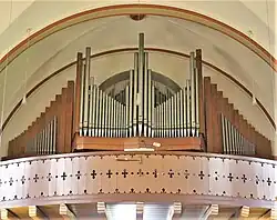 Das Kegelladen-Instrument verfügt über 14 Register, verteilt auf 2 Manuale und Pedal. Die Spiel- und Registertraktur ist elektropneumatisch. Die Disposition lautet wie folgt:[3]