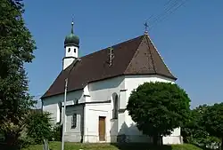 An den 1488 von einem Baumeister aus Tiefenbach bei Oberstdorf erbauten, im Osten dreiseitig geschlossenen, von Strebepfeilern gestützten Chor wurde um 1590 nach Westen das Langhaus angebaut. Dem Satteldach des Langhauses wurde über der Fassade im Westen 1672 ein sechseckiger Dachreiter aufgesetzt, der den Glockenstuhl beherbergt, und der mit einer Zwiebelhaube bedeckt wurde. Die Saalkirche wurde 1783 nach einem Entwurf von Thaddäus Rieff umgestaltet. Der Innenraum des Langhauses ist mit einer Flachdecke überspannt. Auf der Brüstung der Empore im Westen sind die Apostel dargestellt. Die Fresken im Chor, u. a. mit einer Darstellung der Unbefleckten Empfängnis, hat 1813 Konrad Huber gestaltet. Die um 1727 errichtete Statue des Leonhard von Limoges wird dem Umkreis von Ferdinand Luidl zugeschrieben.