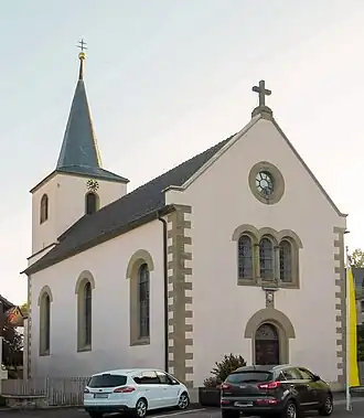 Älteste Bausubstanz der heutigen Saalkirche ist der spätmittelalterliche Chorturm aus dem 15. Jahrhundert.[1] 1617 wurde die Kirche unter Julius Echter von Mespelbrunn erweitert. Der Chorturm ist um ein Geschoss aufgestockt. Er beherbergt die Turmuhr und den Glockenstuhl und ist mit einem achtseitigen, schiefergedeckten Knickhelm bedeckt. Ein erneuter Umbau erfolgte 1687. Im Jahre 1896 wurde das mit einem Satteldach bedeckte Langhaus mit drei Jochen im Rundbogenstil nach Süden angebaut. Über dem Portal in der Fassade befindet sich ein Triforium, darüber im Giebel ein Ochsenauge.