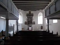 Das tonnengewölbte Turmuntergeschoss ist durch zwei Rundbögen zum Schiff hin geöffnet, die romanischen Kämpfer zeigen Stern- und Blattornamentik. Im Schiff sind eine Flachdecke und eine umlaufende Empore eingebaut. auf der Chornordseite ist eine spätgotische Sakramentsnische, auf der Südseite eine Piscina eingelassen, die beide mit Kielbogenabschluss versehen sind. In der südlichen Schiffswand ist ein bei der letzten Instandsetzung zu Anfang der 1990er Jahre freigelegtes Profil eines spätromanischen Rundbogenportals erhalten.