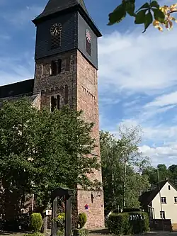 Die Saalkirche St. Lucia mit Westturm ist die evangelische Pfarrkirche von Grünwettersbach, einem Stadtteil im Südosten von Karlsruhe (Baden).