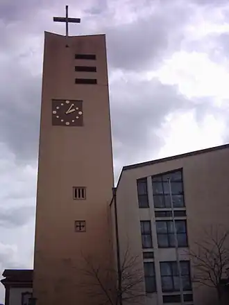 1961 wurde die alte Lämmerspieler Kirche abgerissen und mit dem Bau der heutigen Kirche begonnen. Die Grundsteinlegung für die im Stil der Moderne errichtete Pfarrkirche mit ihrem 27 Meter hohen Betonturm erfolgte am 11. Juni 1961.[3]