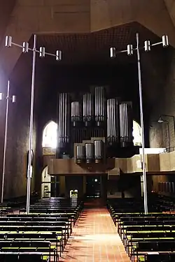 Der sich an den Grundriss der Vorgängerbauten abstrahierend anlehnende Innenraum mit seinen steil aufsteigenden, hochrechteckig segmentierten rohen Betonwänden spiegelt die äußere Gestalt als Negativform wider. Decken und einzelne Wandflächen sind aus gestalterischen und akustischen Gründen durch eine Lochrasterung abgesetzt. In der Höhe formen sich, aus der Wand heraustretend, Winkeln und Kanten sowie kubenartige Austritte und Einschnitte. Die wuchtig hervortretenden Gewölbeansätze aus kubischem Faltwerk leiten gestalterisch zur flach schließenden lochgerasterten Raumdecke über. Wände und Decke bilden eine untrennbare, plastisch gestaltete Einheit. Die zeltartige Auffaltung der Raumdecke greift eines der grundlegenden Leitmotive der deutschen Kirchenbaukunst der 1960er Jahre auf. Das Zelt-Motiv (z. B. 2 Kor 5,1-10 ) steht dabei als Symbol für die sogenannte „Ecclesia peregrinans“, die suchende oder pilgernde Kirche in der Zeit der pastoralen Neuorientierung im Umfeld des Zweiten Vatikanischen Konzils (1962–1965).[35] Darüber hinaus steht das Zelt-Motiv auch im Zusammenhang mit dem biblischen Mischkan (Stiftszelt; lat. tabernaculum, Ex 39,32-43 ), dem transportablen jüdischen Heiligtum, welches nach den Erzählungen des Alten Testamentes das Volk Israel auf seinen Wanderungen nach dem Auszug aus Ägypten mitführte, bevor ein permanentes Zentralheiligtum errichtet wurde.