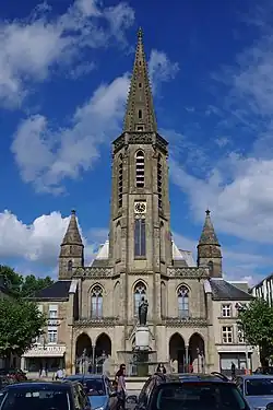 Die zweigeschossig angelegte Fassade ist in eine Arkadenzone und eine Fensterzone gegliedert. Darüber erhebt sich der viergeschossige, sechseckige Kirchturm mit seinem krabbengeschmückten Helm bis zur Spitze der Kreuzblume in einer Höhe von 51 m.[10] Die beiden fassadenflankierenden Wohnhäuser wurden vom Vorgängerbau übernommen. Sie werden von zwei Treppentürmen mit quadratischem Grundriss überragt.
