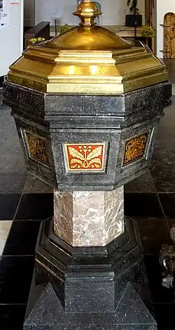 - In der Taufkapelle befindet sich eine Fünte auf einem achteckigen Sockel aus rotem Marmor. Sie besteht aus einem becherförmigen Becken, der aus schwarzem Marmor gefertigt und mit ornamentalen Hinterglaseinlagen verziert wurde. Der Taufstein hat – ohne Messingdeckel – eine Höhe von 90 cm und wurde Ende des 19. Jahrhunderts hergestellt. Neben der Fünte befindet sich in der Taufkapelle vor einer hochrechteckigen Nische ein Eisengitter, das vermutlich von einem ehemaligen Sakramentshäusen stammt. Es ist 70 cm hoch und 43 cm breit und in einem profilierten, gestrichenem Steinrahmen gefasst, der aus Trachyt gefertigt sein könnte. Die Taufkapelle wird von einer hölzernen, 79 cm hohen Balustrade begrenzt, die zu einer früheren Zeit Teil einer Kommunionbank war. Sie wurde von einem Meister Christian hergestellt, der 1705 für sein Werk bezahlt worden war. In der Taufkapelle befindet sich weiterhin eine Skulptur, die Johannes den Täufer zeigt. Sie ist aus Holz in Weiß und Gold gearbeitet, 106 cm hoch und stammt aus der ersten Hälfte des 18. Jahrhunderts. Die Arbeit könnte im süddeutschen Raum entstanden sein.