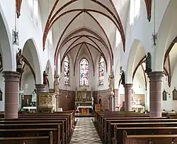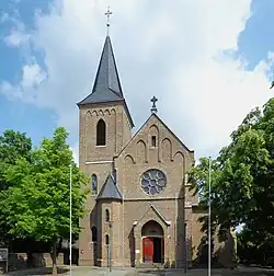 Die Pfarrkirche ist eine neugotische dreischiffige Backsteinbasilika mit nordwestlich angefügtem Turm. Ihre ursprüngliche Innenausstattung, die steinernen Altäre, die Kanzel, die Orgelempore, die Fenster und die Skulpturen sind gut erhalten. Die ursprüngliche Ausmalung wurde 1981 wiederhergestellt. Neben der Kirche befindet sich der alte Friedhof. Dort sind bis auf das Jahr 1650 zurückgehende Grabsteine zu sehen.