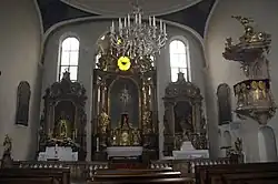 Die Flackdecke im Innenraum ziert ein Deckenfresko von 1803 des Barockmalers Johann Joseph Anton Huber. Es zeigt die Ausgießung des Heiligen Geistes und in den Ecken die Evangelisten. Das gerahmte Hochaltarbild malte Thomas Scheffler 1740; es zeigt Maria mit der heiligen Margarethe sowie die Heiligen Cosmas und Damian. Die Kanzel von 1744 wird von einem Schalldeckel mit einer Weltkugel und einem Adler gekrönt.