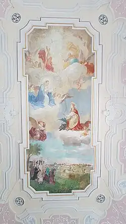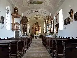 Das Langhaus besitzt im Innern ein flaches Tonnengewölbe und im Westen eine Doppelempore; der Chor sowie die Seitenkapelle sind flachgewölbt.