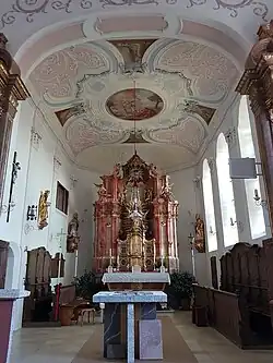 Der reich gegliederte Hochaltar (1730/40) im frühen Rokokostil stammt angeblich aus der 1803 abgebrochenen Klosterkirche Wessobrunn. In der Mitte befindet sich eine Skulptur der hl. Margaretha, assistiert an den Seiten von den hll. Korbinian und Sylvester. Die kostbar verzierte Chordecke schmücken der von Benedikt Heiß 1723/24 ausgeführte Stuck und das Fresko Der Traum Jakobs (1720, Jakob Krenauer). Die südliche Chorseite zieren Glasgemälde (um 1910) von der Mayer’schen Hofkunstanstalt.