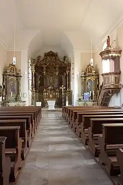 Die barocke Innenausstattung aus dem mächtigen Hauptaltar, zwei Seitenaltären, der Kanzel und zwei Beichtstühlen stammt noch aus der Bauzeit. Der reiche verzierte barocke Hauptaltar ist in unter den Dorfkirchen der Umgebung außergewöhnlich und dem Umstand zu verdanken, dass Schultheiß Moll nicht nur Baumeister, sondern auch vermögender Stifter war, der der Kirche zu Lebzeiten 2500 Gulden für die Anschaffung und testamentarisch weitere 800 Gulden für die Fertigstellung der Altäre vermacht hat.