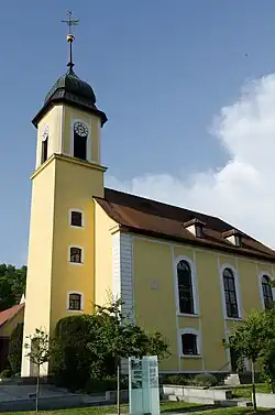Der Turm im Westen hat einen quadratischen Grundriss. Durch ein Stichbogenportal im Westen betritt man die Eingangshalle. An der Südseite sind drei Stichbogenfenster übereinander angeordnet. Das Glockengeschoss hat abgeschrägte Ecken, weist Putzfeldergliederung auf und hat zu allen Seiten rundbogige Schallöffnungen mit Ziffernblatt. Abgeschlossen wird der Turm durch eine welsche Haube. Das Langhaus weist ebenfalls Putzfeldergliederung auf und rustizierte Ecklisenen. Er hat an der Nord- und Südseite auf drei Achsen hohe Rundbogen- und darunter Stichbogenfenster bzw. in der Mitte -portale. An der Ostseite gibt es zwei Rechteckfenster. Er hat ein Satteldach, das gegen Osten abgewalmt ist, zwei Achsen mit Walmgauben an der Nord- und Südseite und zwei Fledermausgauben an der Südseite. Am Osten schließt sich ein Anbau mit Walmdach an.