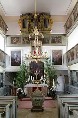 Der einschiffige Saal schließt mit einer Decke flach ab. Eine Doppelempore, die auf toskanischen Säulen ruht, ist an der West-, Nord- und Südseite eingezogen. An der Ostseite gibt es eine Orgelempore. An den Emporenbrüstungen sind 44 Darstellungen aus dem Leben Christi angebracht. Die Herrschaftsempore befindet sich an der Westseite. Der Kanzelaltar befindet sich an der Ostseite, davor der Taufstein, links und rechts davon sind Sitzgelegenheiten für die Herrschaften. Die gesamte Inneneinrichtung stammt aus dem Jahr des Kirchenneubaus.