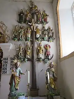 Zur Kirchenausstattung gehört der barocke Hochaltar aus der abgebrochenen Kirche des Klosters der Bamberger Karmeliten. In der zentralen Nische mit einer vergoldeten Muschel in der Kalotte steht eine Anna-selbdritt-Skulptur, flankiert wird sie von zwei weiblichen Heiligen. Links vom Hochaltar steht auf einem Sockel die hl. Margareta, die einen Drachen an der Kette führt. Auf der anderen Seite des Altars befindet sich eine raumhohe skulpturale Darstellung der vierzehn Nothelfer.