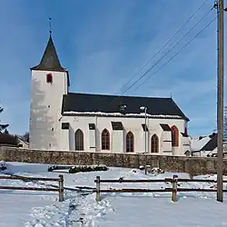 Die zweischiffige spätgotische Hallenkirche von fünf Jochen steht in zentraler Ortslage. Sie wurde mit reichen Stern- und Netzgewölben auf je vier achteckigen und runden Pfeilern um 1500 erbaut. Zweischiffige Kirchen treten in der Eifel nur vereinzelt auf, so auch in der Nachbargemeinde Kronenburg. Der seltene Baustil wurde wohl von Kardinal Nikolaus Cusanus in die Region gebracht.[3] Das südliche Schiff schließt dreiseitig, das nördliche mit flachbogiger Apsis. Im Innenraum ruhen Stern- und Netzgewölbe auf schlanken, kapitelllosen Pfeilern; die Hauptschlusssteine sind skulptiert. Der Sakristeieinbau im Nordchor wurde 1890 nach einem Entwurf von Heinrich Wiethase ausgeführt. Im Laufe der Zeit wurde die Kirche mehrfach umgebaut, während des Zweiten Weltkrieges wurde sie stark beschädigt. Die Beschädigungen wurden zum großen Teil bis 1949 beseitigt.[4] In den Jahren 1954 und 1955 wurde der Innenraum nach Befund gefasst. Der Unterbau des Turmes wurde wohl in romanischer Zeit, die Obergeschosse um 1559 errichtet. Der Turm ist ein Wehrturm, ihm ist eine geknickte Schieferpyramide aufgesetzt.[5][6]